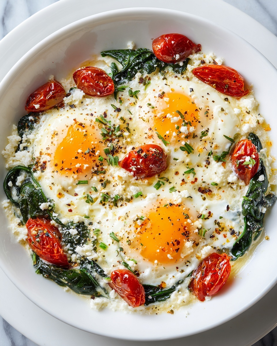 Baked Feta Eggs with Spinach and Tomatoes Recipe