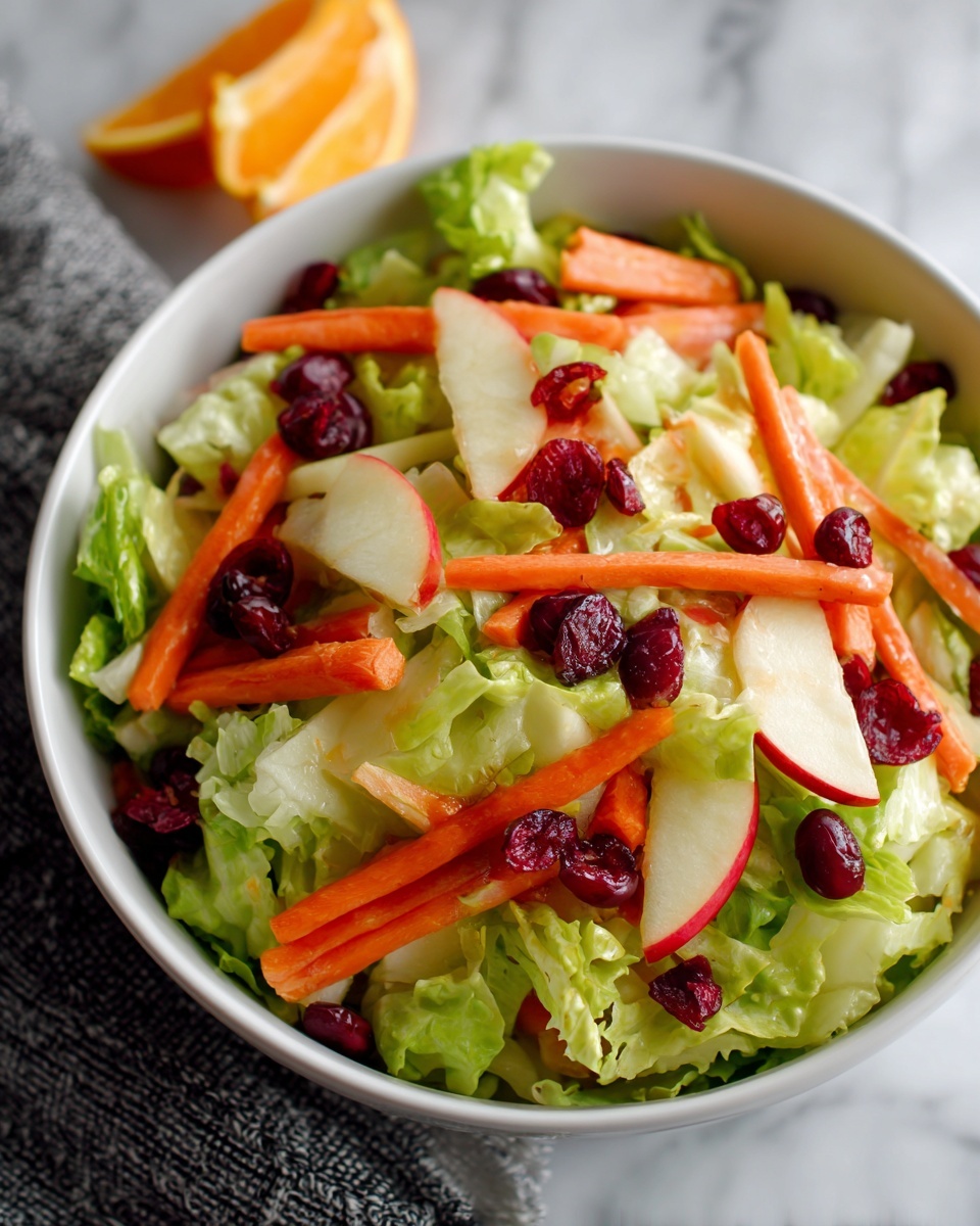 This refreshing Carrot Apple Salad combines crisp matchstick-cut apples and carrots with tangy cranberries and sweet mandarin segments, all tossed in a creamy vanilla yogurt and mayo dressing. It’s a perfect make-ahead side dish that offers a delightful balance of sweet, tangy, and creamy flavors, ideal for summer picnics or holiday meals.