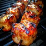 4. Grill the chicken skewers: Place the skewers on the grill and cook for about 3–4 minutes on each side. During the last few minutes, brush the skewers generously with the prepared sauce to glaze the chicken, allowing it to develop a slightly charred, caramelized surface while ensuring the chicken is fully cooked.