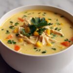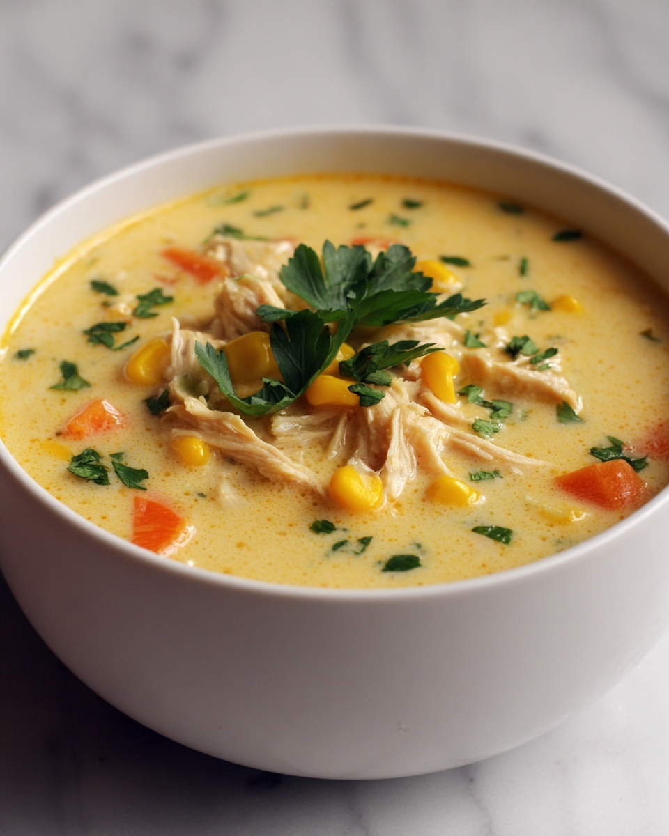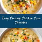 This Creamy Chicken Corn Chowder is a comforting and hearty soup perfect for a quick weeknight meal. Combining tender shredded chicken, sweet cream-style corn, and a medley of sautéed vegetables in a rich, creamy base, this chowder delivers a deliciously smooth texture and satisfying flavor in just 30 minutes.