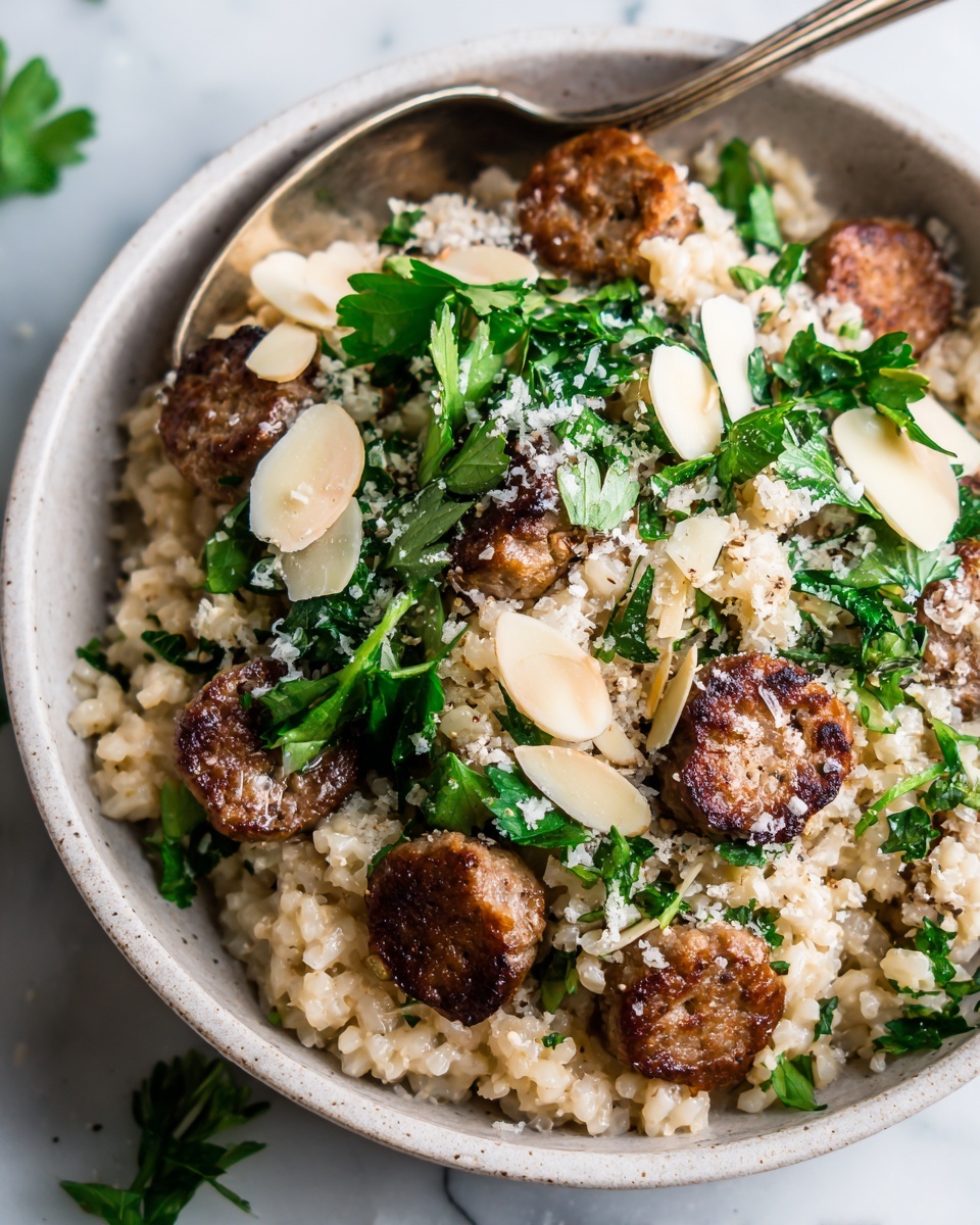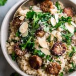 A comforting and creamy Italian sausage and rice casserole packed with savory flavors from spicy Italian sausage, sautéed mushrooms and onions, and a rich sour cream sauce, all topped with crunchy almonds and fresh parsley. This easy-to-make one-pan dish comes together in 35 minutes and makes a hearty family meal.