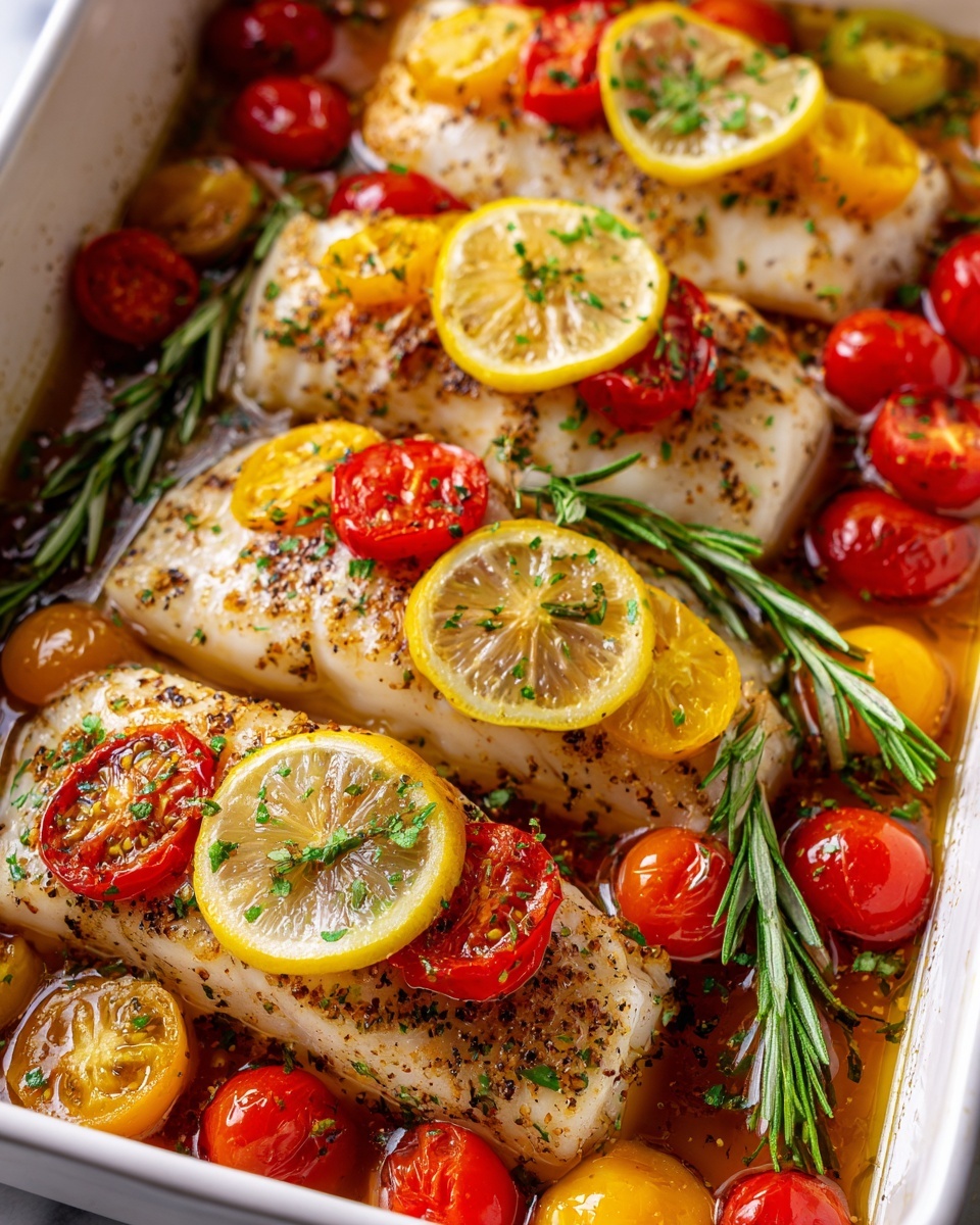 This Easy Mediterranean Baked Fish recipe offers a flavorful and healthy way to enjoy tender fish fillets infused with fragrant herbs and surrounded by vibrant vegetables. Perfect for a quick weeknight dinner, it combines fresh thyme, rosemary, oregano, and parsley with juicy cherry tomatoes, olives, zucchini, and onions, all baked to perfection in the oven.