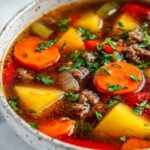 This Easy Vegetable Beef Soup is a hearty, comforting dish perfect for a nutritious meal. Made with tender ground beef or stew beef, a medley of fresh and frozen vegetables, and simmered in a flavorful broth with herbs, this soup is simple to prepare and deliciously satisfying.