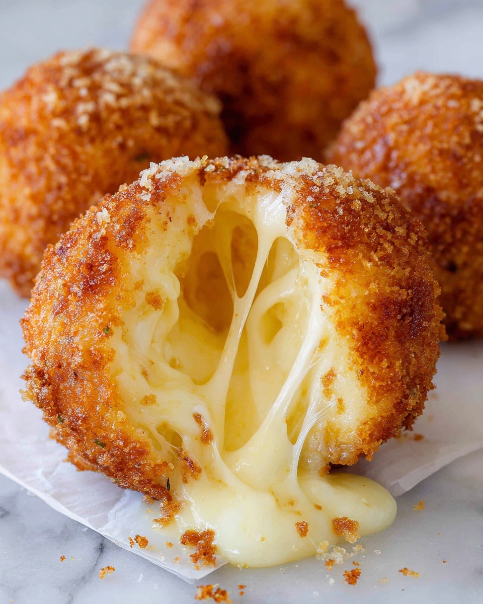 While still warm, sprinkle the balls with salt and pepper to taste. Serve immediately for the best texture and flavor experience. You’ll love how the crisp exterior gives way to a warm, gooey surprise inside!