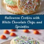 Take two teaspoons from each colored dough, press them together, and roll into balls. Flatten slightly, then roll the edges in festive Halloween sprinkles. Press a few white chocolate chips into each cookie ball for little pockets of gooey delight.