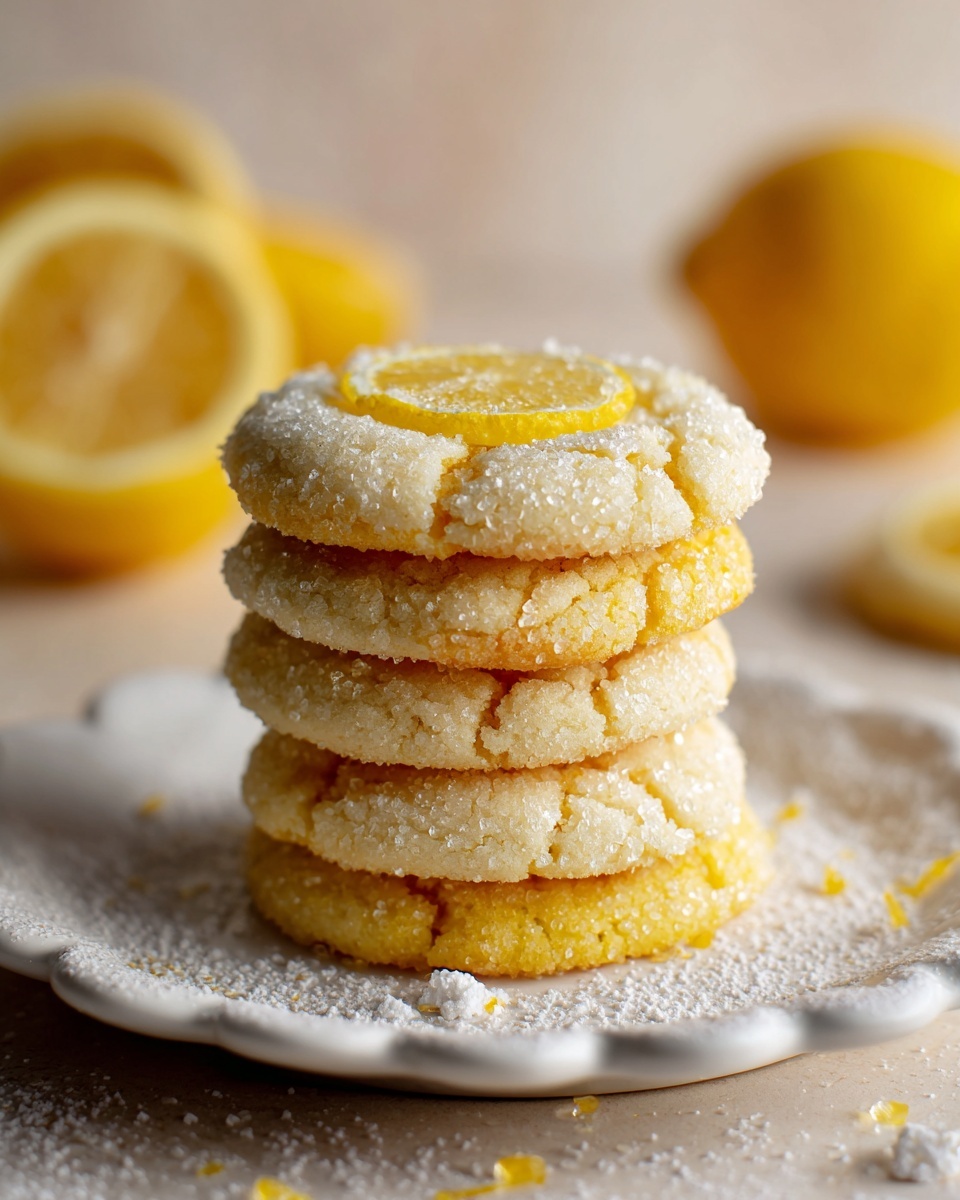Elevate your lemon sugar cookies by garnishing with a sprinkle of finely chopped pistachios or a light drizzle of lemon glaze. These little additions bring an extra pop of flavor and make your presentation feel special and inviting.