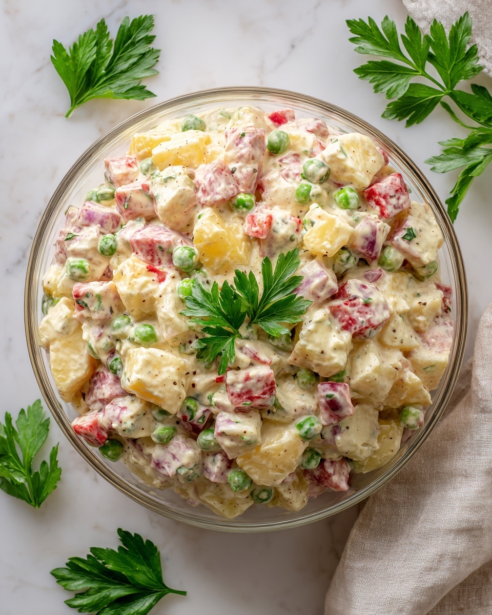 Now, fold in the diced red onion, crisp celery, and chopped parsley. These ingredients contribute an irresistible crunch and fresh herbaceousness, turning the salad from simple to truly vibrant in every mouthful.