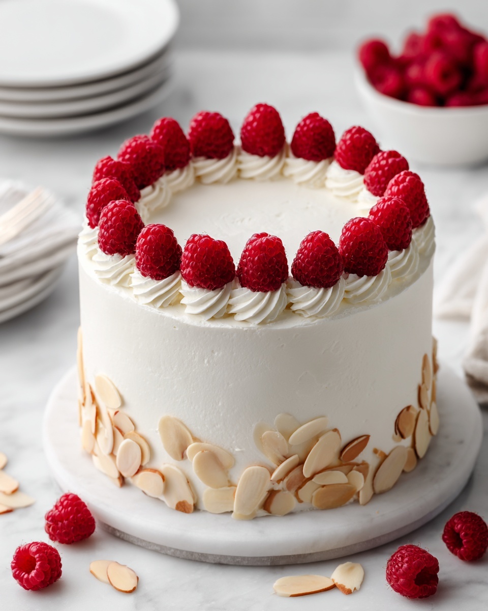A moist and tender Raspberry Almond Cake featuring a delicate almond glaze. This American dessert combines fresh raspberries and sliced almonds in a fluffy cake base, enhanced by almond extract for a delightful nutty aroma. Perfect for berry lovers seeking a simple yet elegant treat.