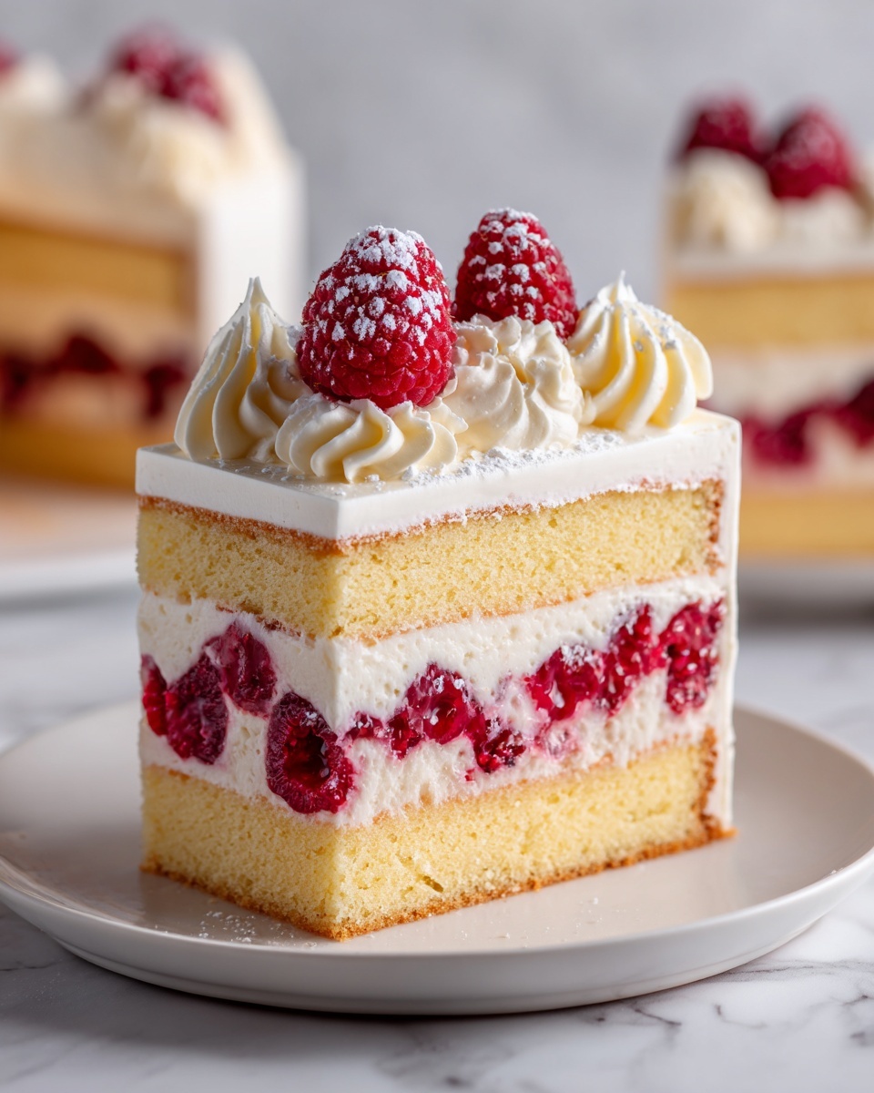 - Garnish and Chill: Decorate with fresh raspberries, lemon slices, and lemon zest as desired. Refrigerate the cake until ready to serve to enhance flavor and texture.