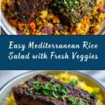 A refreshing Mediterranean rice salad featuring cooked long-grain rice tossed with fresh cherry tomatoes, cucumber, red bell pepper, red onion, black olives, and crumbled feta cheese. Dressed with a tangy olive oil and red wine vinegar dressing infused with Dijon mustard, oregano, salt, and pepper. This salad is perfect as a healthy side dish or light meal, served chilled or at room temperature.
