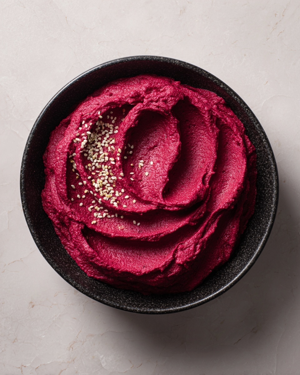 Transfer your stunning beetroot hummus to a serving bowl and drizzle with a touch of olive oil for a glossy finish. You can also sprinkle sesame seeds or fresh herbs like parsley or cilantro on top to add texture and a pop of green contrast.