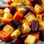A vibrant and hearty medley of roasted root vegetables, including carrots, parsnips, sweet potatoes, red onion, and beets, seasoned with fresh herbs and olive oil. Perfect as a nutritious side dish or a flavorful vegetarian main course.
