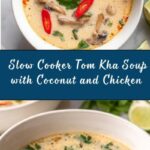Slow Cooker Tom Kha Soup is a flavorful Thai coconut chicken soup made with tender chicken thighs, creamy coconut milk, aromatic lemongrass, kaffir lime leaves, fresh ginger, and spicy Thai chilies. This comforting soup is slow-cooked for hours to develop rich, vibrant flavors and is garnished with fresh cilantro, green onions, and lime wedges for a refreshing finish.