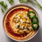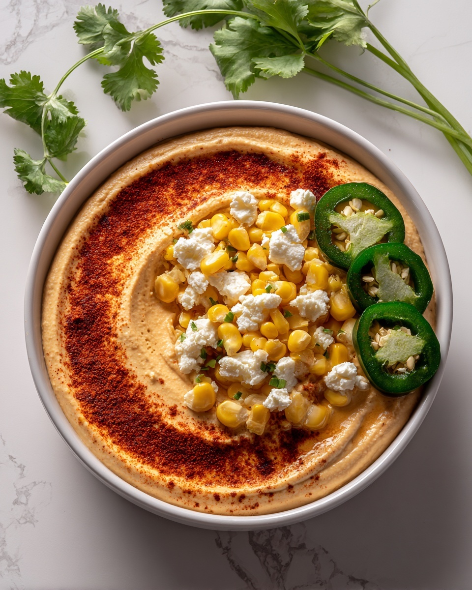 - Assemble and Garnish: Drizzle the remaining tablespoon of olive oil over the hummus base. Top with the warm cooked corn, sliced serrano pepper, vegan cotija-style cheese, chopped cilantro, and a pinch of paprika. Finish with a sprinkle of flaky sea salt for texture and flavor. Serve immediately with your favorite dippers such as pita, veggies, or chips.