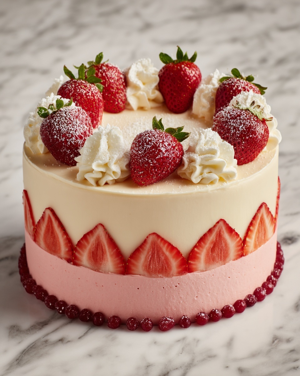 The fresh strawberries and edible gold sprinkles are not just decoration—they add bursts of juicy sweetness and a shimmering sparkle that make this cake feel truly special. Dusting with powdered sugar enhances the cake’s delicate appearance and adds a pleasant touch of extra sweetness.