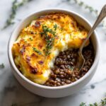 This Vegan French Onion Shepherd’s Pie combines rich caramelized onions and hearty French green lentils in a savory base, topped with a creamy cauliflower and potato mash. Perfect for a comforting, plant-based meal, this dish is seasoned with thyme, garlic, and nutritional yeast for depth of flavor and baked to golden perfection.